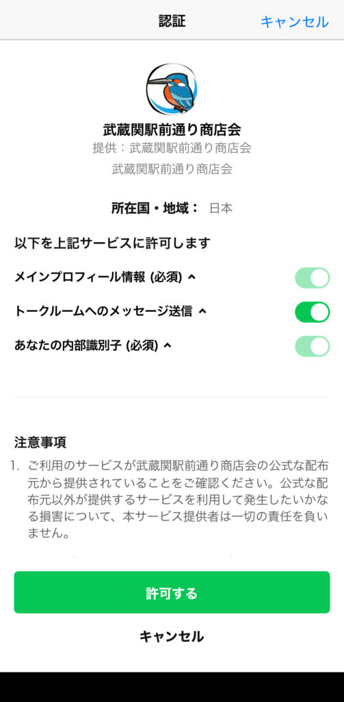 表示される文面をお読みいただき、問題がなければ「許可」をタップしてください。